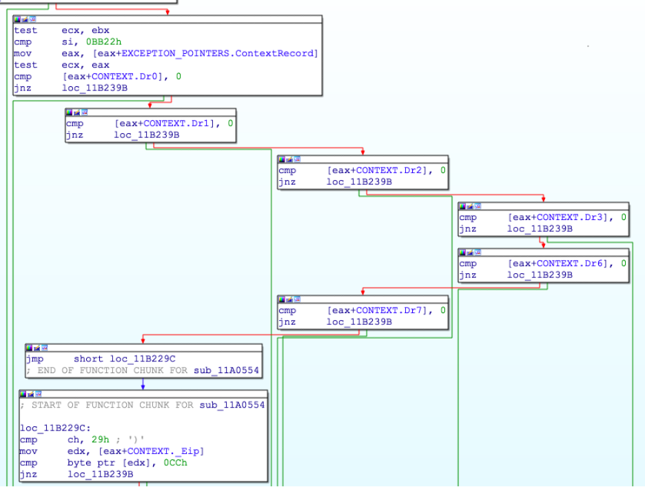 Initially, as the exception happens, _CONTEXTRECORD structure is checked for the presence of hardware registers, i.e., the x86 debug registers: