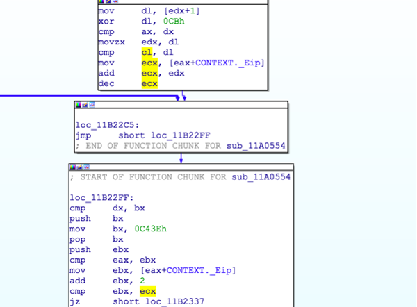 The byte after the exception EIP is XORed with 0xcb, and the result is added to the current EIP to get the next location for execution. The instruction in between the exception EIP and the calculated EIP is filled with junk instructions to confuse the disassembler, as illustrated below: