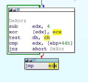GuLoader encrypts the main binary code at any point in the calling of any system API, which invariably makes the dumped code useless. The following two images depict “XORing the code before the call” and “deXORing after the API call”, respectively.