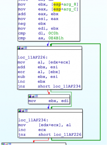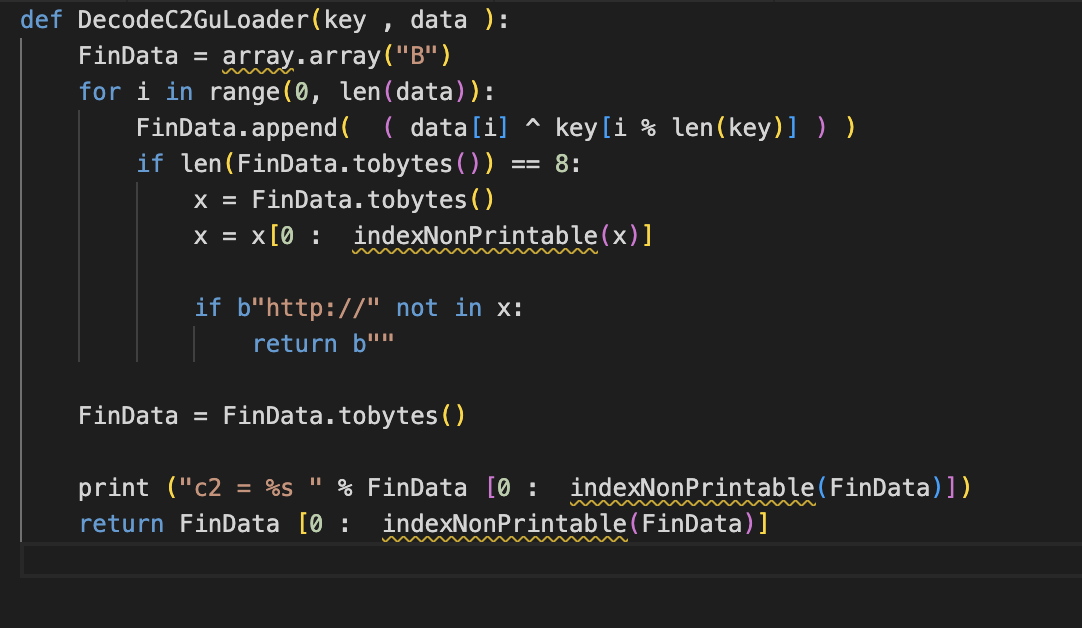 Once the dump is successful, we have to locate the key. This process is reasonably straightforward, as GuLoader encrypts the botnet command and controller (C&C) with the same subroutine as the strings. Here’s the string decoding subroutine: