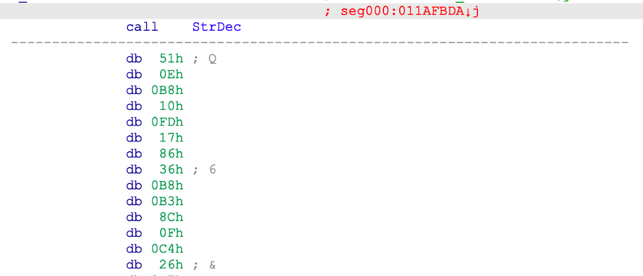 Tracking back, we can observe that the key parameter is pushed using a direct call opcode. That’s precisely the location of the XOR key to be used.
