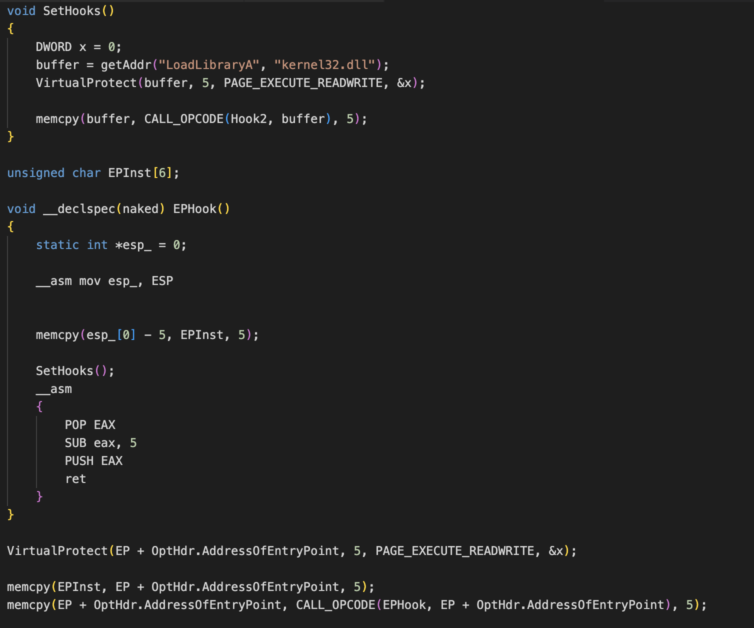 To exploit this weakness, you can set up a DLL hook after OEP is reached, as shown in the code below: