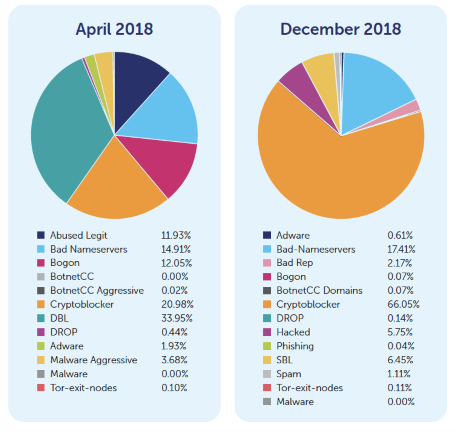 The charts below illustrate the significant increase in cryptominer malware that has been blocked on a regional healthcare provider’s network by DNS Firewall, comparing April 2018 to December 2018.