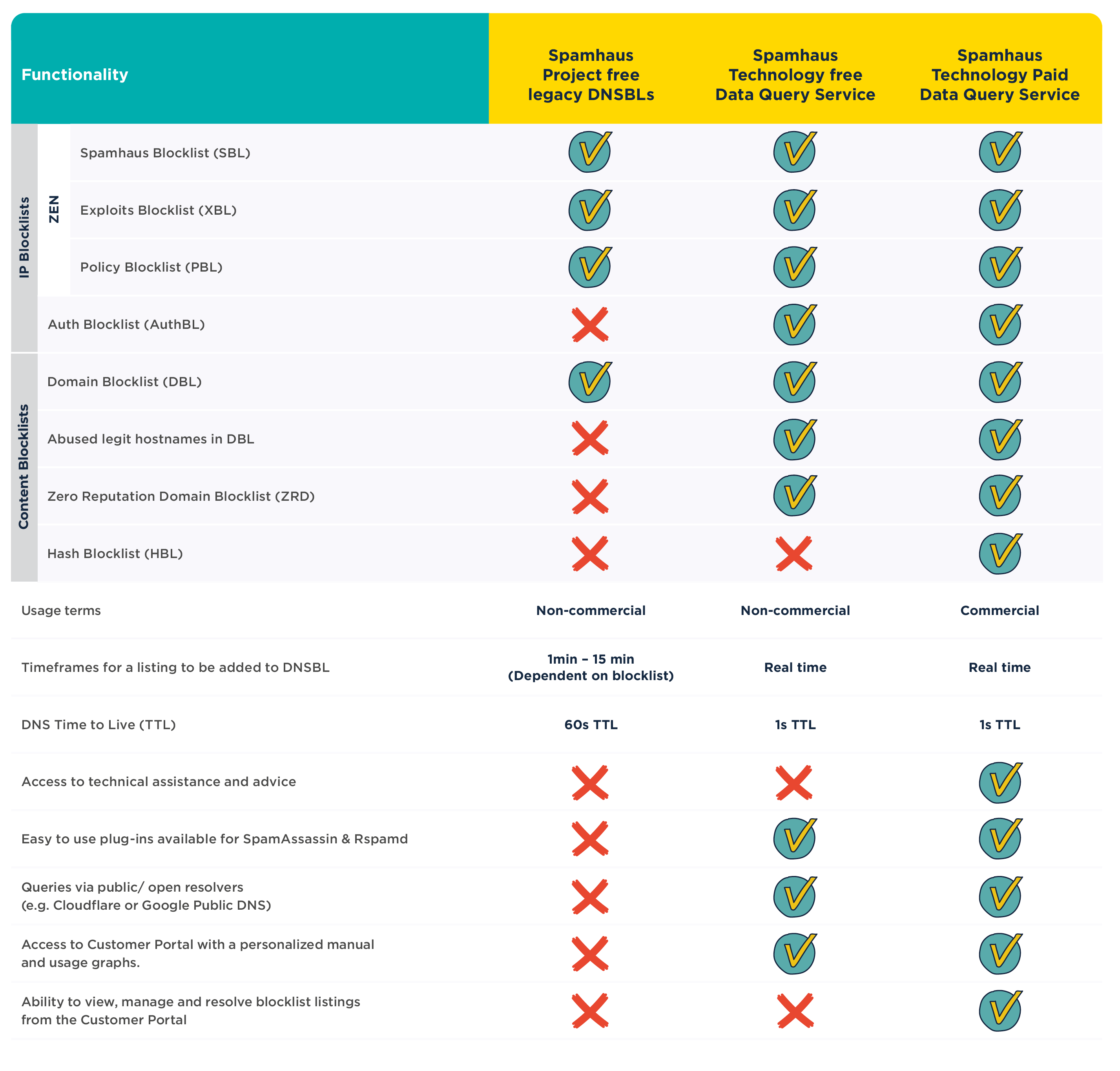 To understand how functionality compares between the different Spamhaus DNSBL offerings, take a look at this table.
