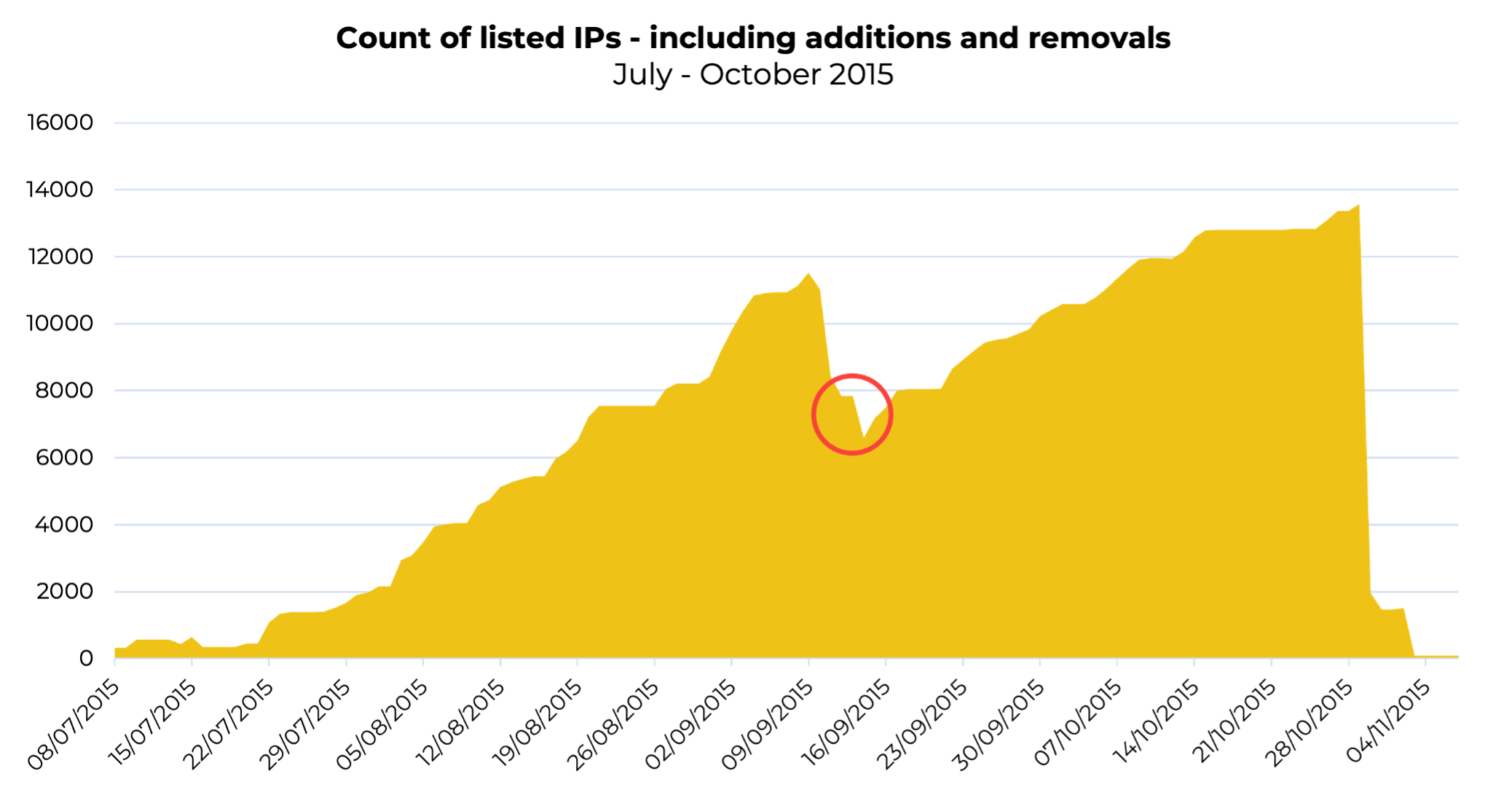 The red circle in the above chart indicates the point that SoftLayer initially thought they had gotten a handle on the situation, with listings starting to decline, before once again rising. At this point, Spamhaus decided to stop removing listings until SoftLayer took action to ensure this wasn’t going to continue.