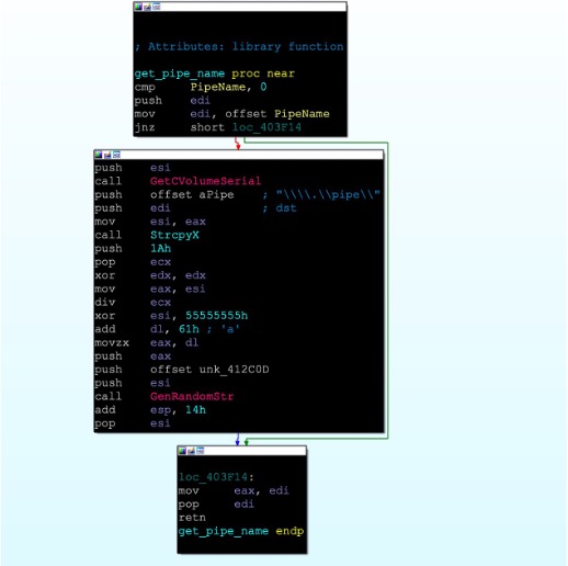 An algorithm is used to generate the pipe name, creating a name based on a predetermined value. This value is specific to the infected machine and is based on the hard drive’s volume serial number. The malware purposefully does this to make hardcoded indicator of compromise (IOC) detection impossible on machines.