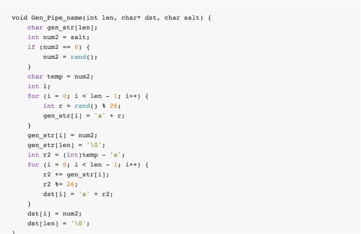 An algorithm is used to generate the pipe name, creating a name based on a predetermined value. This value is specific to the infected machine and is based on the hard drive’s volume serial number. The malware purposefully does this to make hardcoded indicator of compromise (IOC) detection impossible on machines.