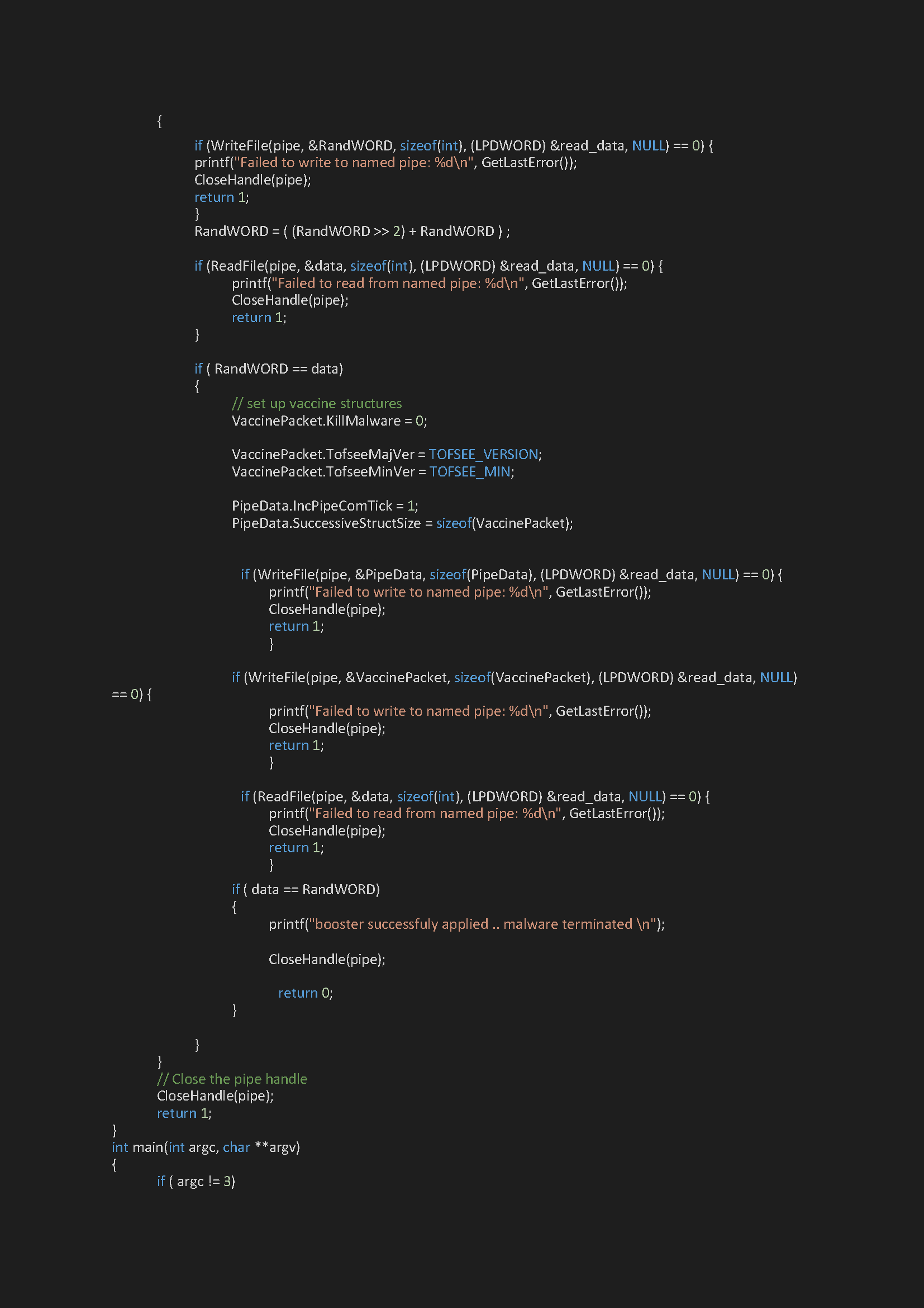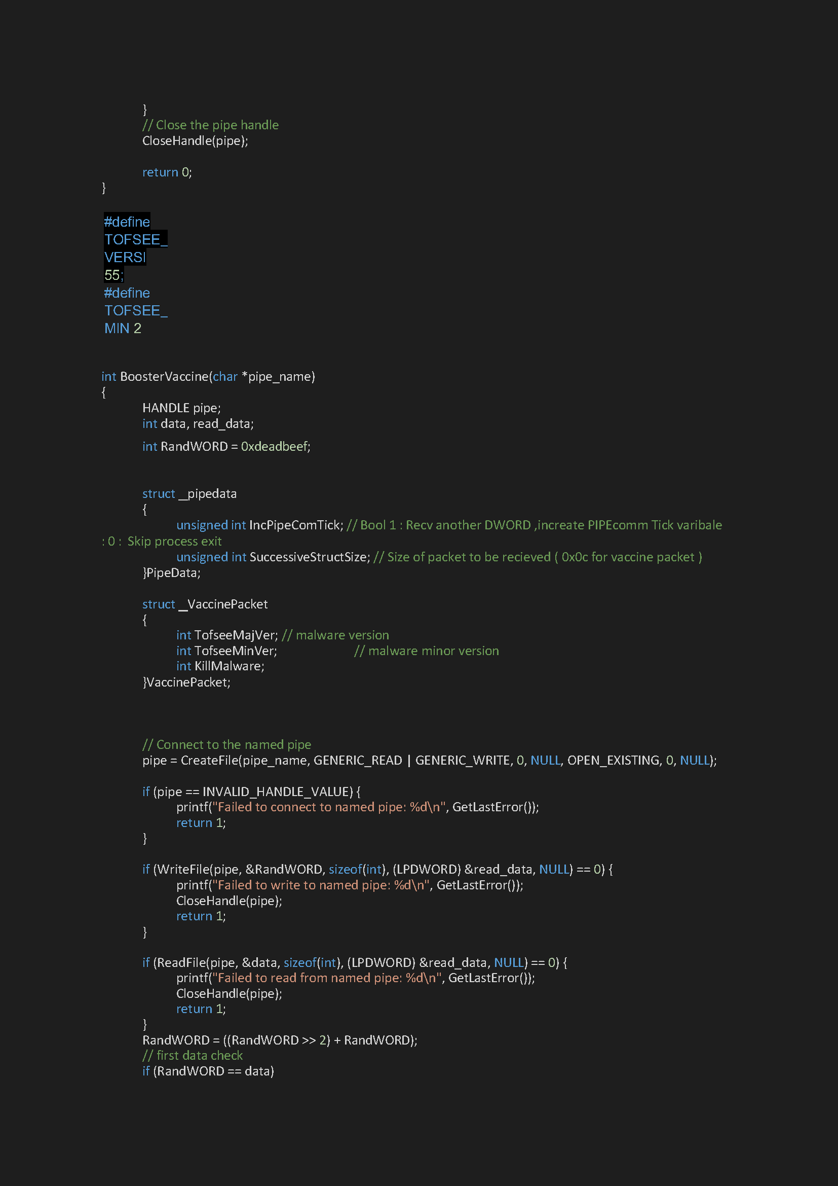 In the binary, we noticed a subroutine where Tofsee opens an IPC pipe and processes various data. The malware uses this IPC channel to communicate with another running instance to trigger an exist.