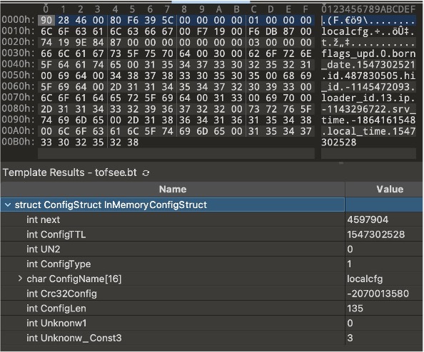 Each ConfigValue buffer has its internal structure based on the ConfigType value. This chained config is dumped and stored in various locations on the infected system so Tofsee can retrieve it after a reboot.