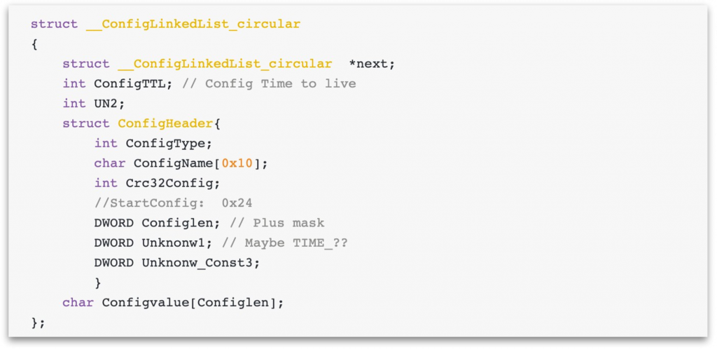 During the runtime of Tofsee and the communications with its command and control (C&C) server, Tofsee stores various configuration values pertinent to the proper runtime of the code in a memory-based structure which we call the InMemoryConfig store. This is a circular linked list structure, and Tofsee defines it as follows:
