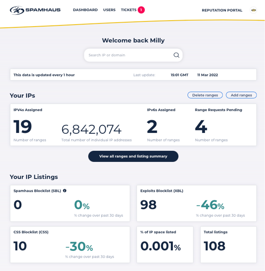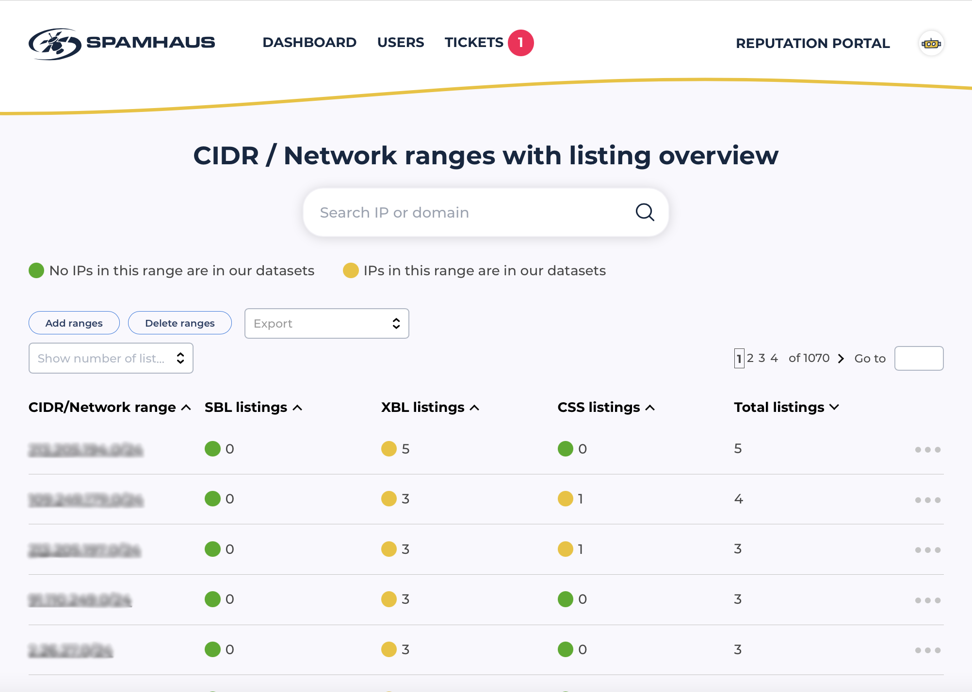 Here you can track all your requests and communications with the Spamhaus team. This includes adding or deleting ranges from your network, changing user details, or working with the team to resolve a listing issue.