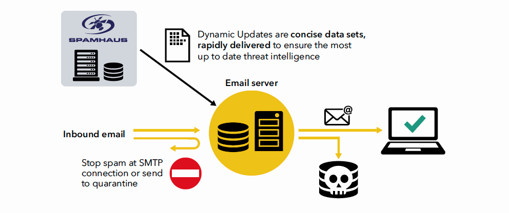 Dynamic Updates from Spamhaus protect by alerting you to hailstorm attacks within seconds of them starting, giving you the unique capability to block this type of spam.