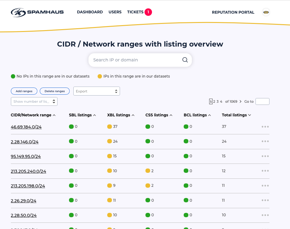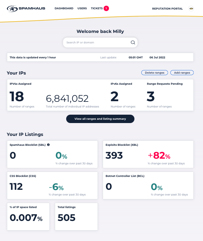 Here you can track all your requests and communications with the Spamhaus team. This includes adding or deleting ranges from your network, changing user details, or working with the team to resolve a listing issue.