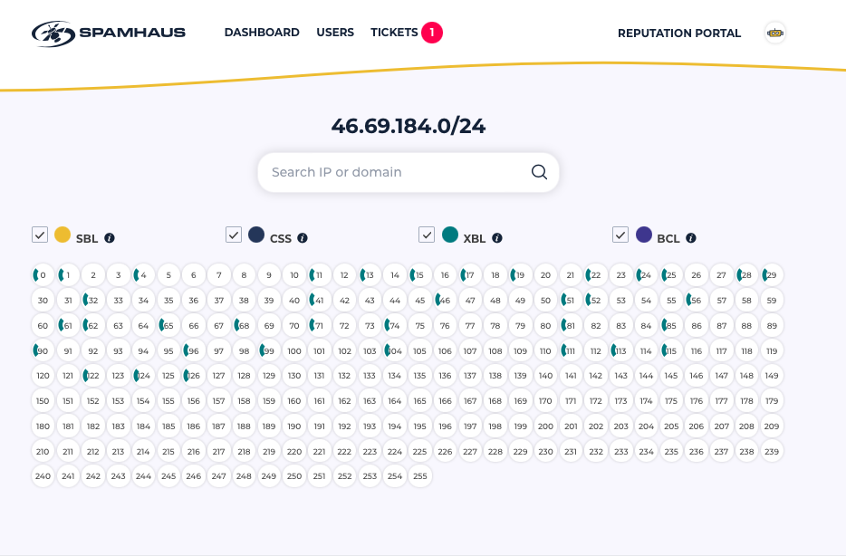 This area lists all your ranges by /24, along with the number of SBL, XBL, CSS, and BCL listings. All the information is fully sortable and can be exported, should you require. From this page, you can quickly navigate to a heatmap of a specific /24.