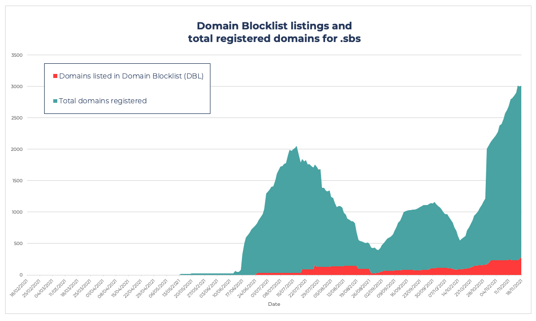 The graph below clearly illustrates how .sbs is starting to grow in popularity. The green shows the total number of newly registered domains. Unfortunately, that popularity is not only shared amongst legitimate operators, as the red in the graph shows. In the past month, our analysts listed 10% of their total registered domains. Now, in the grand scheme of things, that’s not a disgraceful percentage; after all, in the Top 10 Most Abused Top Level Domains, operators are showing rates between 19%-59%.